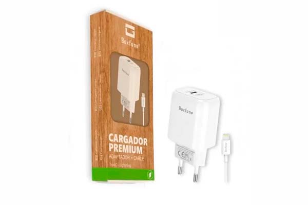 – Cable de carga con conexión Tipo C a Lightning.